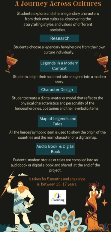 Taşköprü Fen Lisesi İngilizce Öğretmeni Şerife ÇİÇEK, “The Legend Inside You” adlı eTwinning projesi çalışmalarını Litvanya, Yunanistan, Polonya, İtalya, Hırvatistan (2) ve Türkiye (3) olmak üzere toplam 9 ülke ortaklığında tamamlanmak üzeredir. Projenin amacı, farklı kültürlerdeki kahramanların kökenlerini, hikayelerini, özelliklerini ve toplum üzerindeki etkilerini keşfetmek, efsanelerin temalarını, ahlaki derslerini, kültürel veya tarihsel bağlamını analiz etmek, eğlenceli ve ilgi çekici bir şekilde kültürleri keşfetmektir. Bu proje sayesinde öğrenciler İngilizce hikaye anlatma becerilerini, okuduğunu anlama ve konuşma becerilerini geliştirmişler aynı zaman da farklı kültürleri tanıma fırsatı bulmuşlardır.